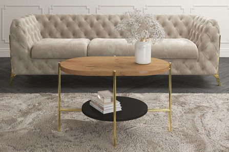 Nowoczesny stolik kawowy Dancan ARENA / złota podstawa + dębowy i czarny blat