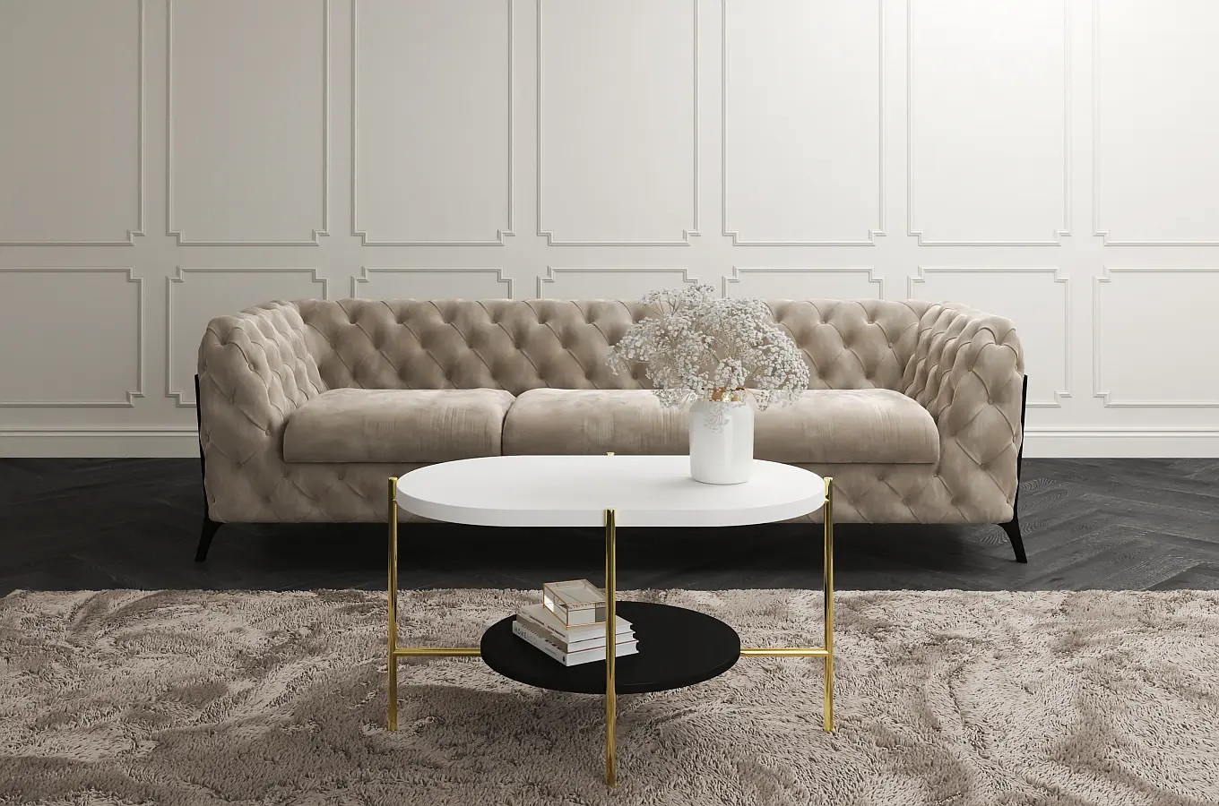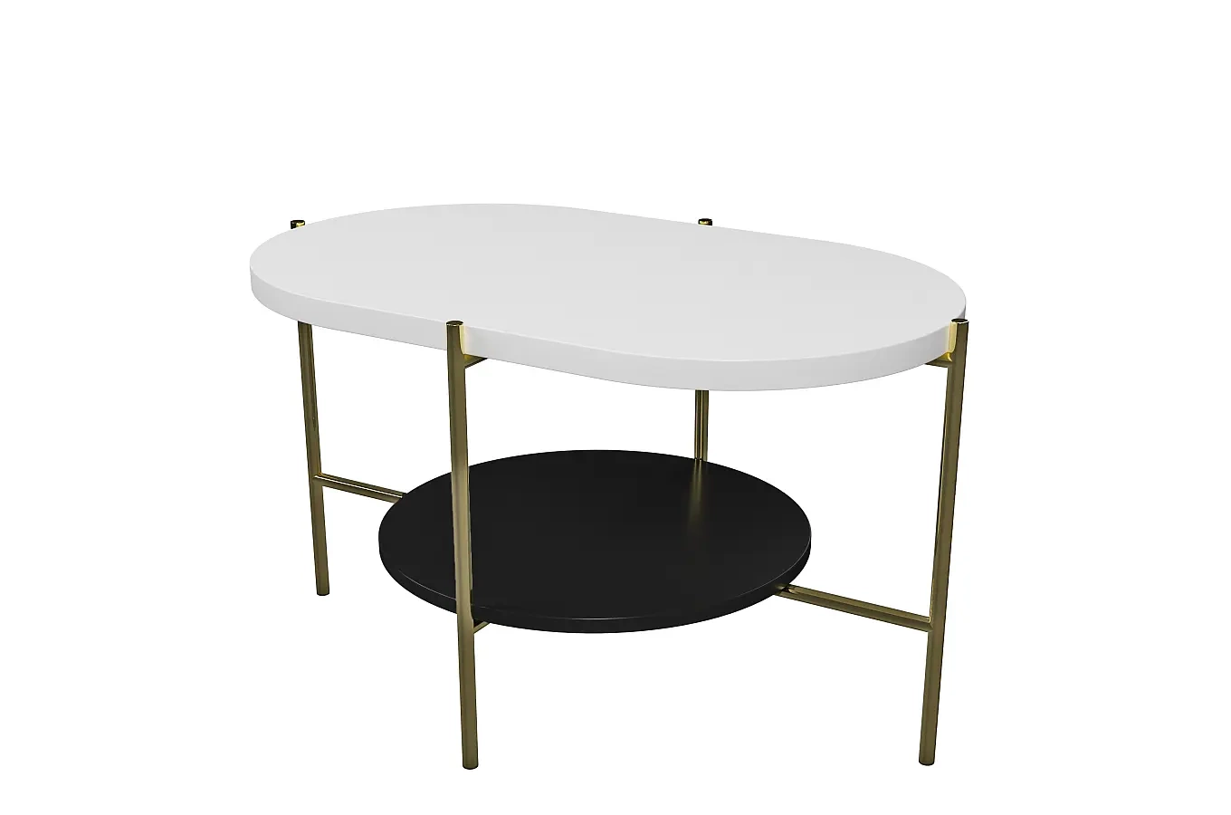 Każdy element został przemyślany: trwałe płyty meblowe wykończone laminatem, stabilne mocowanie na śruby i gumowe nakładki, które chronią podłogę i zapobiegają przesuwaniu. Całość opiera się na solidnej metalowej konstrukcji pomalowanej na zloty kolor i wykończonej w połysku. Stolik dostępny jest aż w ośmiu wariantach – możesz dopasować kolorystykę do własnego pomysłu na wnętrze. ARENA świetnie odnajduje się tam, gdzie liczy się oryginalność – nie udaje klasyki, nie próbuje się dopasować. Po prostu robi swoje.